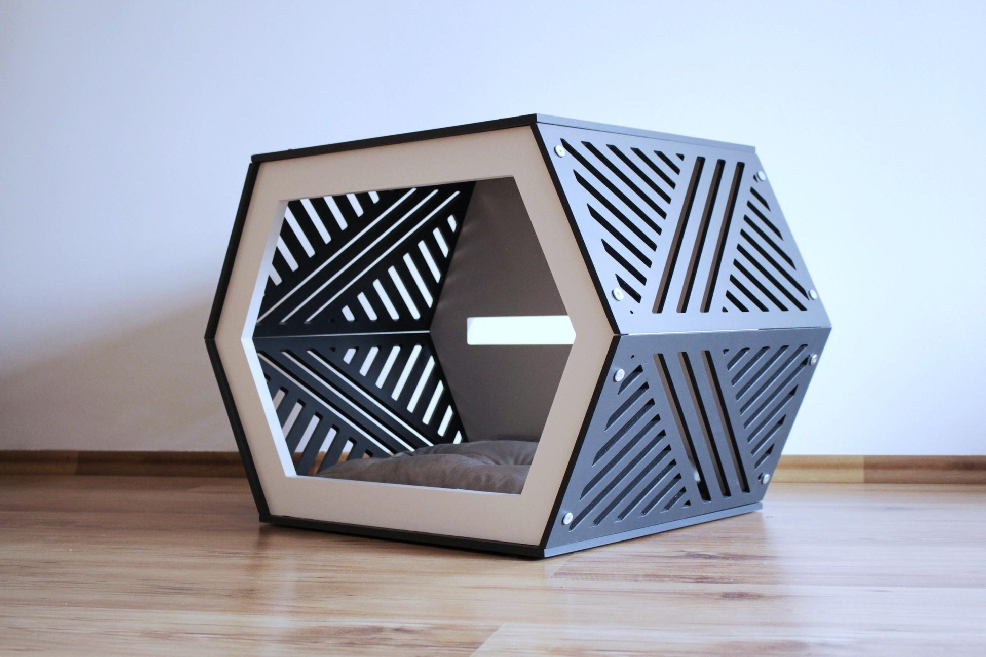 This handmade dog and cat house provides a stylish and secure living space for your pets. Made from high-quality birch plywood and painted with harmless, water-based paint, it ensures both durability and aesthetic appeal. The hollow fiber-filled cushion retains its shape while providing breathability for added comfort.