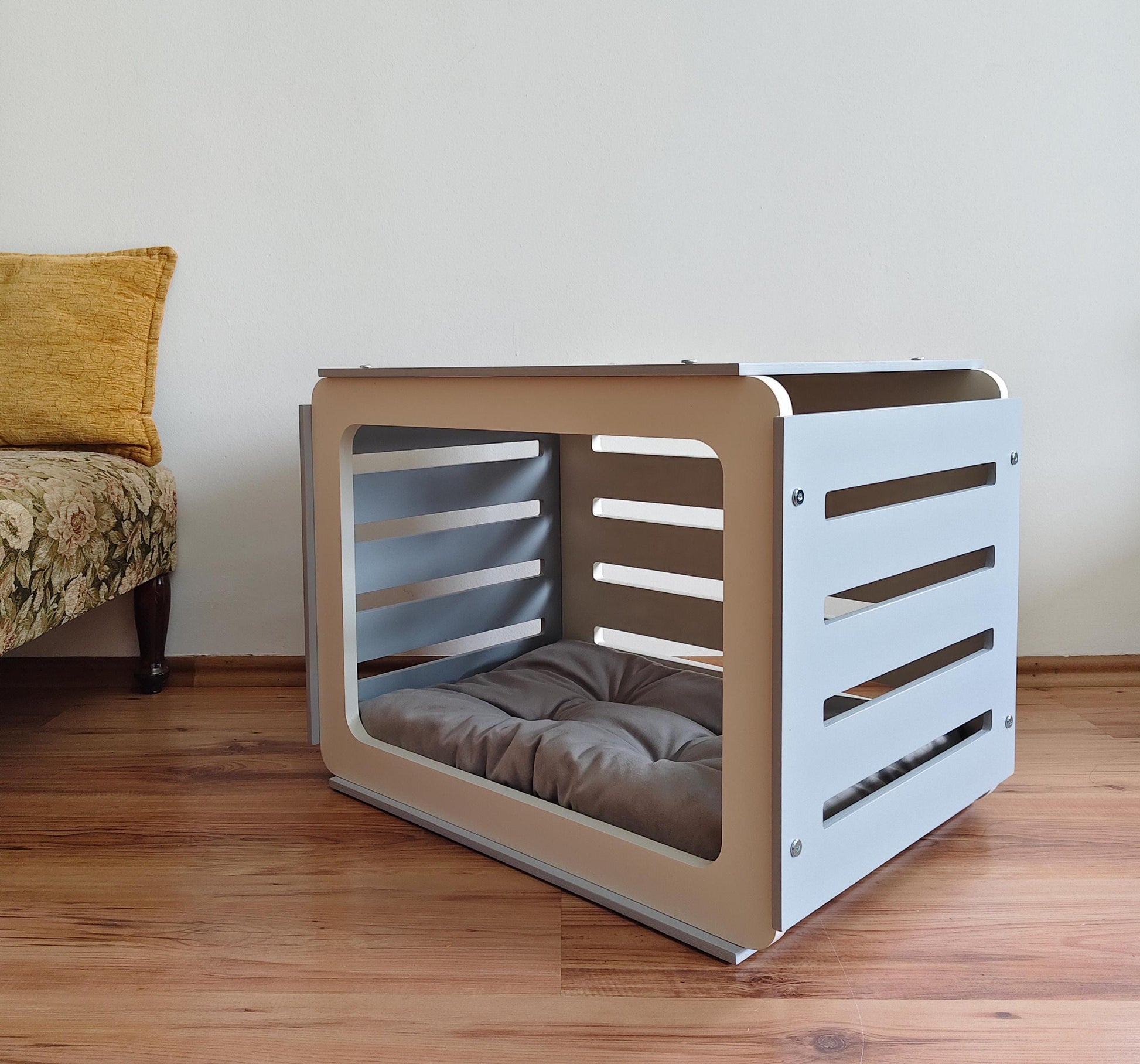This handmade dog and cat kennel offers a stylish and safe living space for your pets. Constructed from high-quality birch plywood and painted with harmless and non-toxic water-based wood stain, this kennel provides both durability and aesthetic appeal. The hollow fiber-filled cushion maintains its shape while providing breathability for extra comfort. Each product is meticulously handcrafted and custom-made to order, providing a completely personalized experience for you and your pet. The wood's natural beauty and sturdy construction ensure years of use.